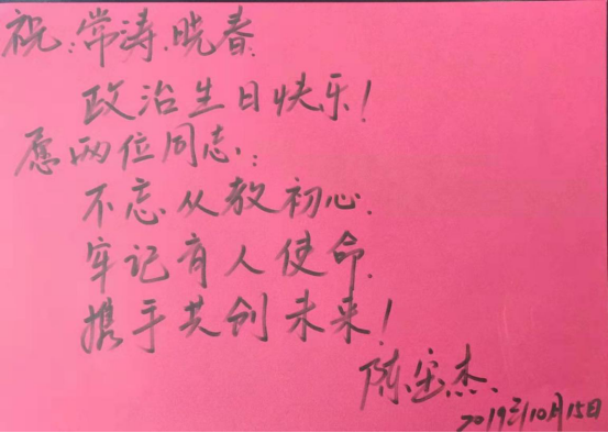 活动前两天,同志们已经在支部群里通过“手写祝福话语,拍照传递祝福”的形式为两位同志送去了祝福。两位老师均表示,看到老师们手写的祝福,感觉这种形式很温馨,写的内容很感动。