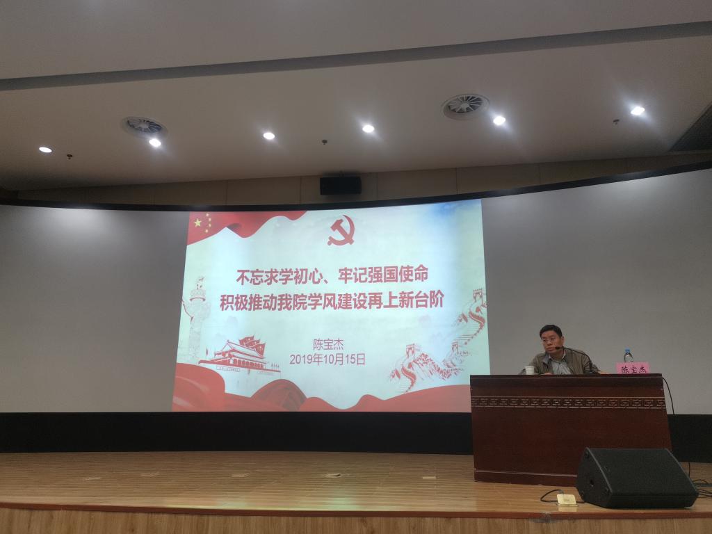 根据学校“不忘初心、牢记使命”主题教育部署安排,10月15日晚上,72886必赢欢迎光临党委书记陈宝杰以“不忘求学初心,牢记强国使命,积极推动我院学风建设再上新台阶”为题,为全院学生党员、入党积极分子和学生干部讲主题教育专题党课。