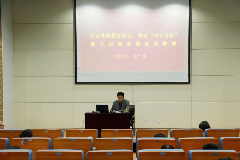最后,李广慧强调,作为一名教育工作者,一定要自觉做中国特色社会主义的坚定信仰者和忠实实践者,忠诚于党和人民的教育事业,把党的教育方针贯彻到教学管理工作全过程,有坚定的政治信念、科学的思维方法,对中国特色社会主义的思想认同、理论认同、情感认同高度一致,自觉进一步增强道路自信、理论自信、制度自信、文化自信,使自己成为一名人民满意的优秀教师。
