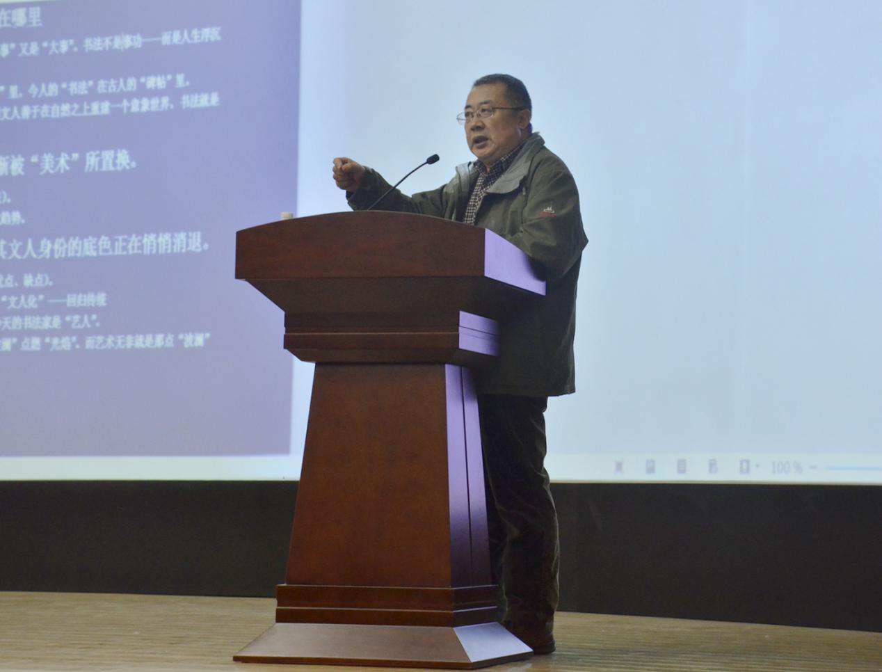 于教授从文字历史展开演讲,详述了“书法的文化特质的表现”。他提出“书法是书法家的情怀”、“书法是从毛笔书写到各种流派、五种字体形成的过程”的观点,对书法现状进行了分析。他指出,书法的文化特质虽然正逐渐被“美术”所置换,但其最终目的依旧是“修齐治平”。谈中外文化差异及书法家专业化的问题时,他反复强调着意象以及做半个文人的重要性。