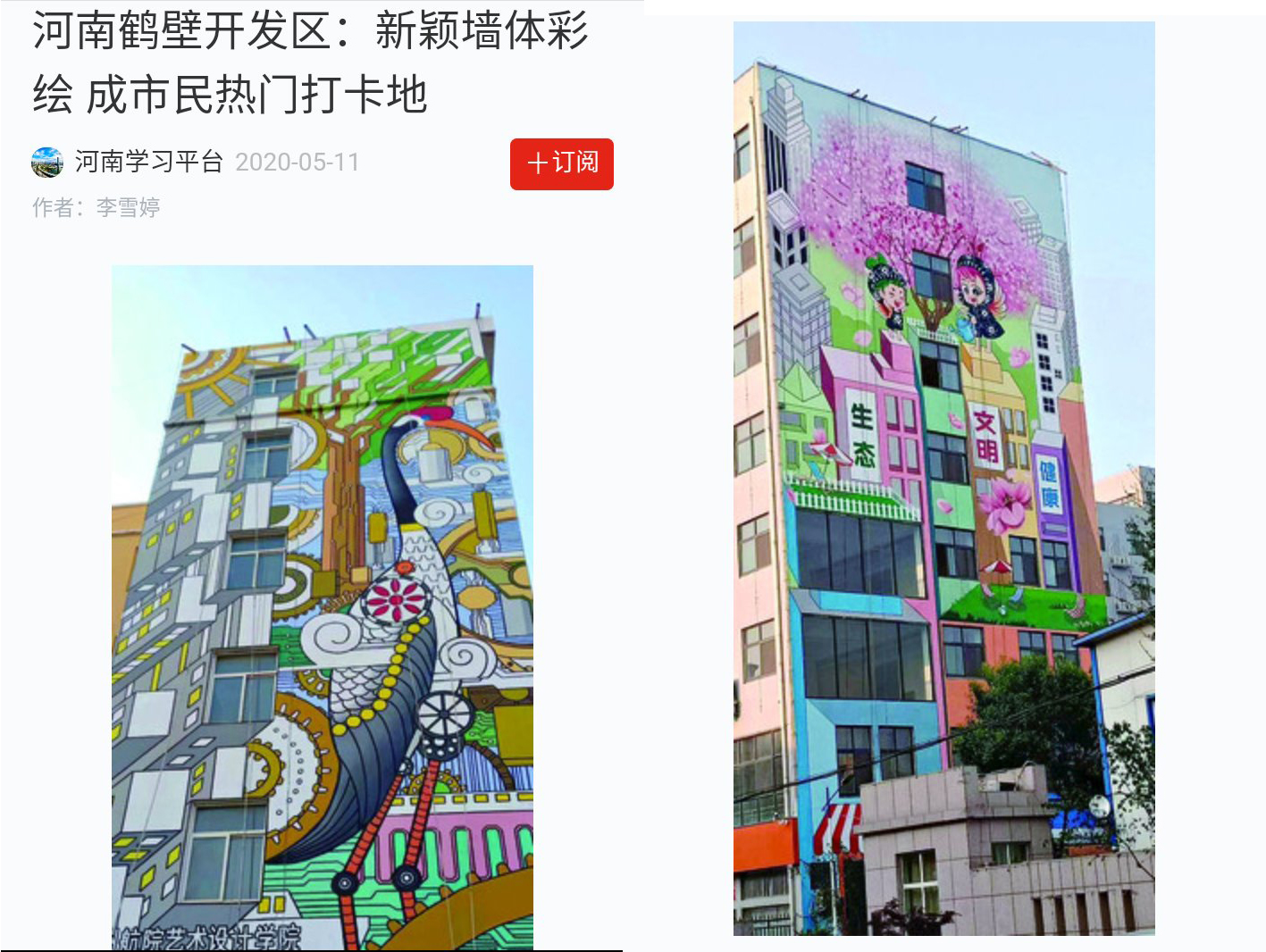 据报道,为深入美化城市环境,提升城市品位,鹤壁经济技术开发区城市综合执法局邀请孙建华团队对辖区民营工业园两栋大楼进行墙体彩绘。两幅墙体彩绘《巨鹤》与《浇灌》完成后,吸引不少市民到此拍照留念,成了市民热门打卡地。