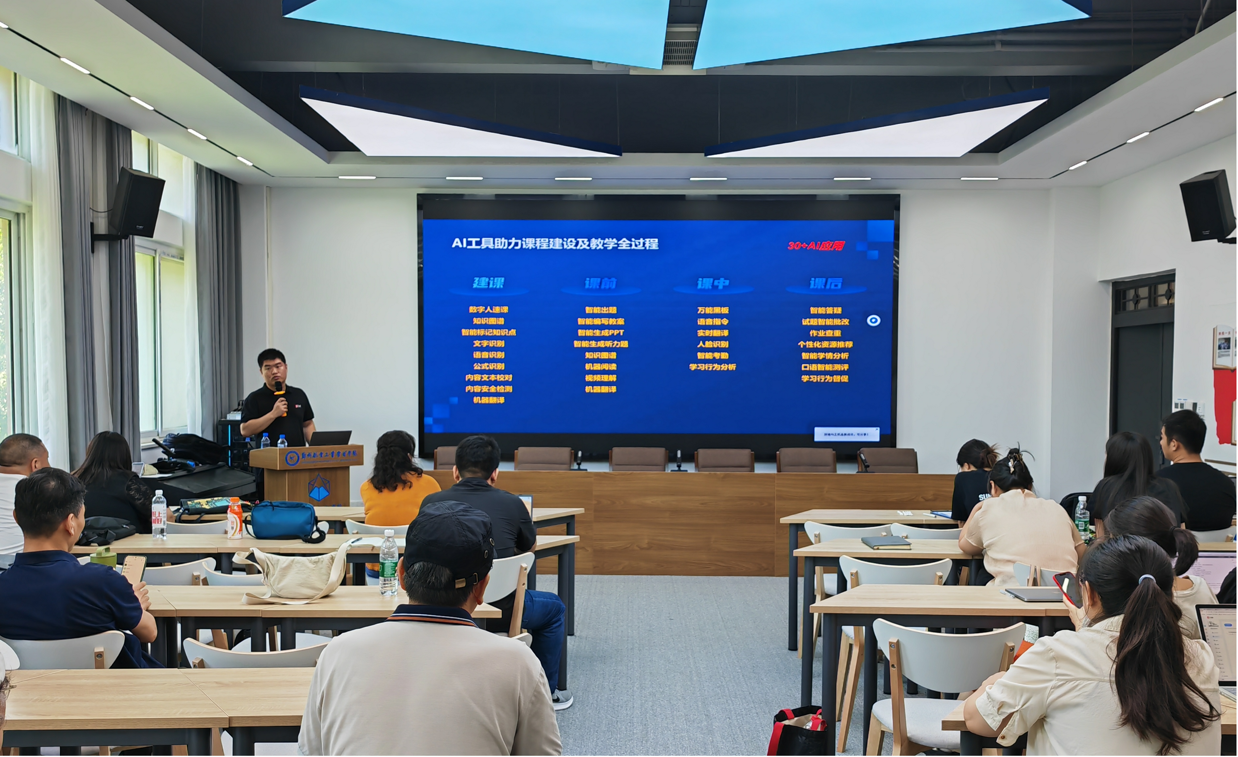 培训会上,武杰斌围绕超星智慧课程的五大核心要素展开深入讲解,重点介绍知识图谱、AI教学助手及AI工作台等前沿工具的应用场景,直观展示了AI技术在高效完成课程建设、优化教学流程等方面的优势,为教师们带来智慧教学平台的沉浸式体验。讲解结束后,针对部分教师提出的AI工具应用问题,武杰斌结合自身经验,提供了切实可行的指导与建议。