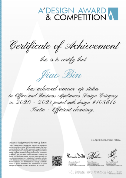 意大利A'设计大奖赛创建于2010年,是目前世界上规模最大、种类最多的综合性设计比赛。旨在发掘和表彰全球范围内最卓越的设计、技术和创意,为获奖者提供国际性展示平台,从而激励设计师、机构以及品牌创造出更多优质的产品、项目和服务,推动社会发展,促进行业共荣。焦斌副教授设计团队在2021意大利A' DESIGN AWARD中获得Runner-up奖项1项。